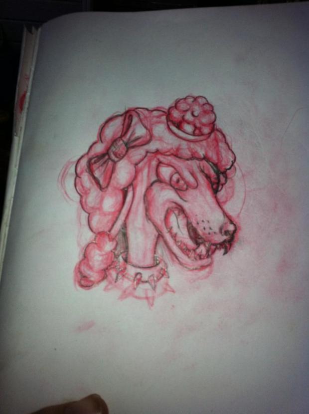 Anyhow, the gal’s brother is a tattoo artist and sketched out a rough draft of an angry poodle for a girls team logo. I’m including it at the bottom of this post. All the girls like it – except for one who said “hell no!” I asked her to sketch her an idea and send it to me.