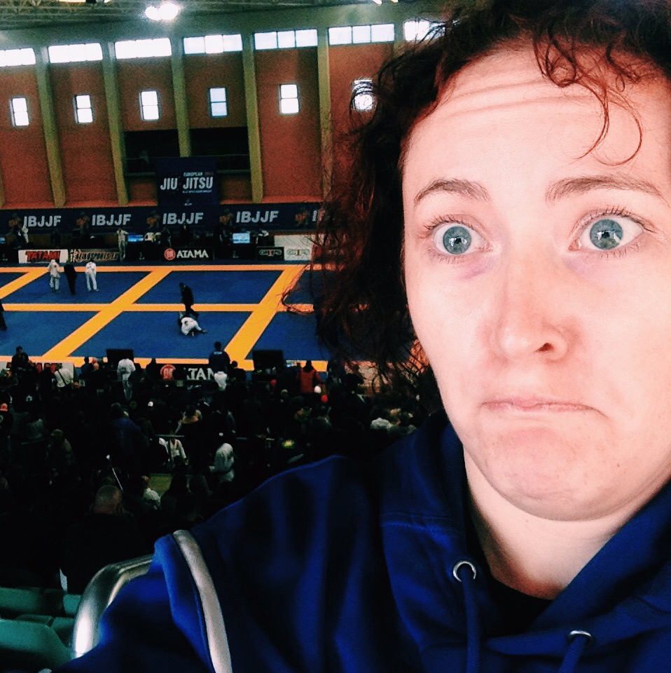 My match was meant to be the 5th one in my division, but since it was the first match that the coordinator found, it got bumped to the first event of the day! So this means being escorted past the curtain out to the side of the mat while the tv commentators are talking and the crowd is starting to rumble in the background. I was grinning like a fool. So happy to be there after all the work I put in to make it happen. This was going to be me showing my best game.